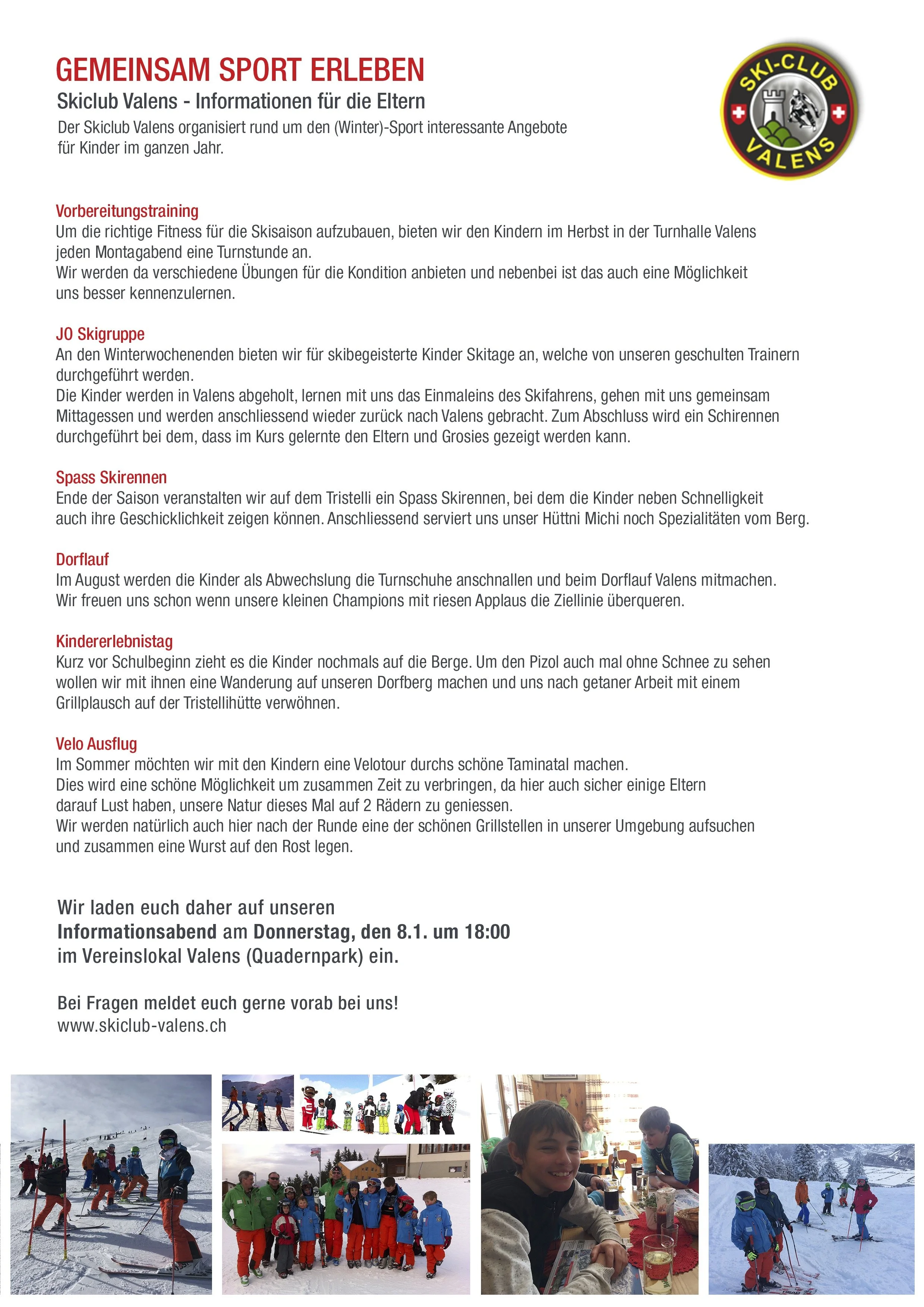 Herzlich Willkommen im Winter in Valens-Vasön im Herzen des Taminatals ❄️ Loipebericht St.Margrethenberg Aktuelle Veranstaltungen Im Vollbildmodus anzeigen Empfohlen Nov. 1 01.11.2025 – 22.03.2026 Wintersaison Skihüttli Golerberg St.Margrethenberg 01.11.2025 – 22.03.2026 01.11.2025 – 22.03.2026 Nov. 2 02.11.2025 – 01.05.2026 Winterpause Stellplatz Mapragg 02.11.2025 – 01.05.2026 02.11.2025 – 01.05.2026 Feb. 7 07.02.2026 Fasnacht Valens-Vasön 07.02.2026 07.02.2026 Aktuelle Vereinsarbeit Empfohlen 09.12.2025 Adventskonzert & Samichlausbesuch 09.12.2025 09.12.2025 04.10.2025 Einweihung Valenser Geschichte(n) auf dem Pizol 04.10.2025 04.10.2025 15.09.2025 Einweihnung neue Calandaschaubrücke 15.09.2025 15.09.2025 17.07.2025 Beitrag SRF - Stellplatz Mapraggsee 🏕️ 17.07.2025 17.07.2025 05.06.2025 Neue Brücke Calandaschau 05.06.2025 05.06.2025 05.06.2025 Fundamente für Valenser Geschichte(n) 05.06.2025 05.06.2025 03.05.2025 Arbeitstag 2025 03.05.2025 03.05.2025 Wetter & Webcams Valens Wetterprognose Wetter Valens Webcam Vättnerberg Vattis